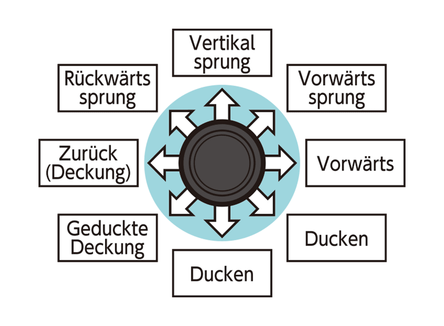 | Rückwärtshüpfer | Tippe ↖ oder R1+↖ |