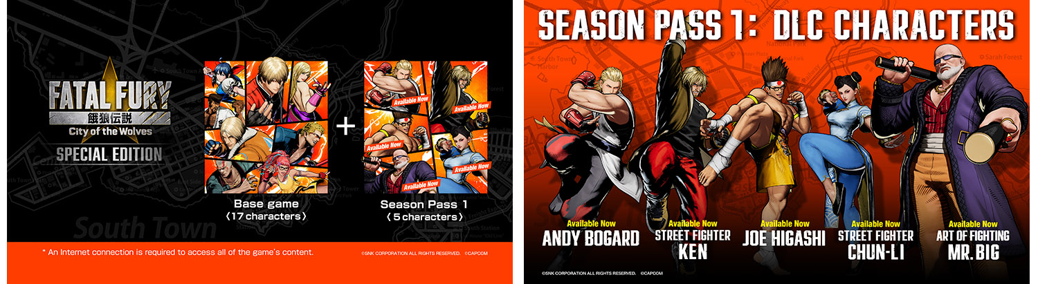 以DLC角色“Mr. Big”为首,包含《STREET FIGHTER》系列的“肯”“春丽”等角色的“季票1”于一体的游戏套装“饿狼传说:群狼之城 SPECIAL EDITION”,正在好评发售中!