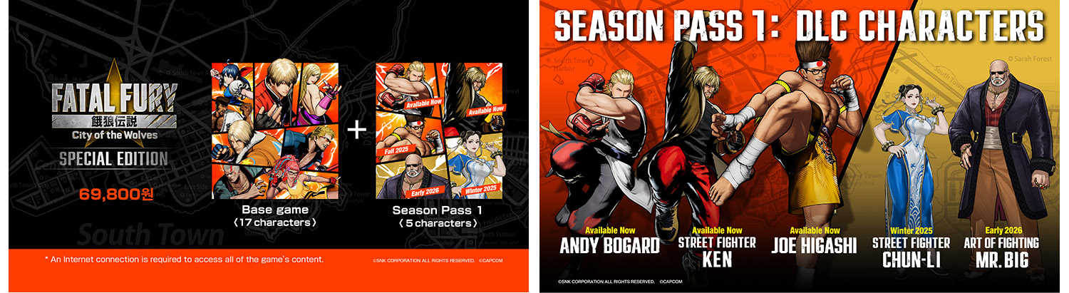 DLC 캐릭터 ‘죠 히가시’를 비롯해 『Street Fighter』 시리즈의 ‘켄’, ‘춘리’ 등으로 플레이할 수 있는 Season Pass 1이 포함된 「아랑전설 시티 오브 더 울브스 SPECIAL EDITION」이 현재 인기리에 판매 중입니다!