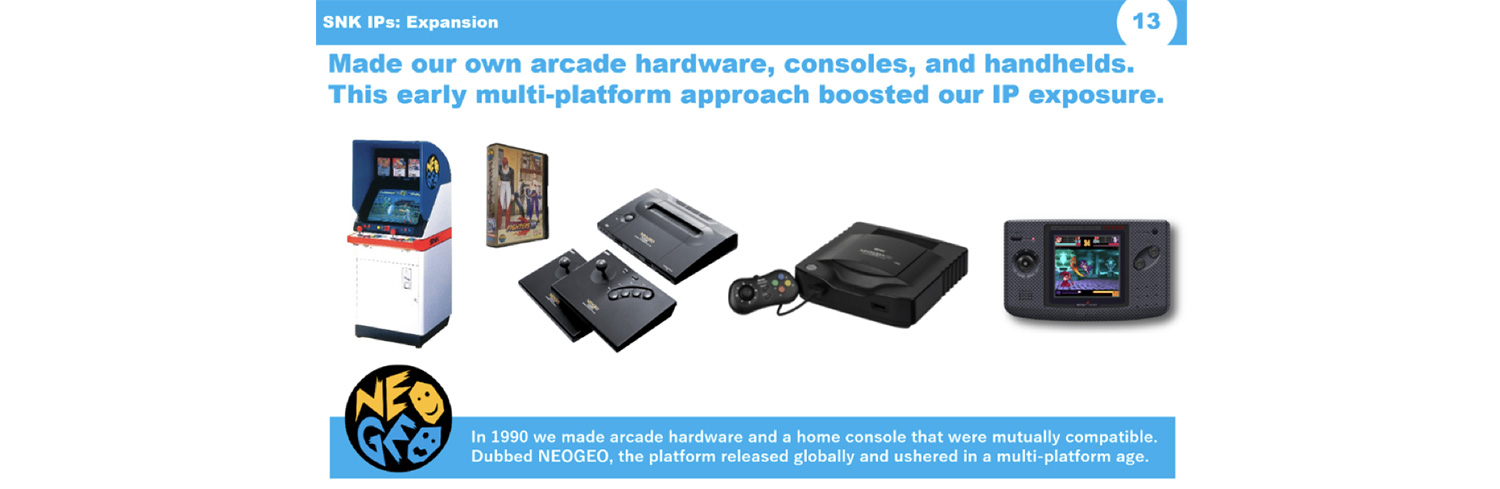 講演冒頭、SNKが保有する200以上ものIPの中で、リリースから30年以上経った今もなお『餓狼伝説』や『THE KING OF FIGHTERS』、『メタルスラッグ』などは世界中のファンから支持されていることを紹介。