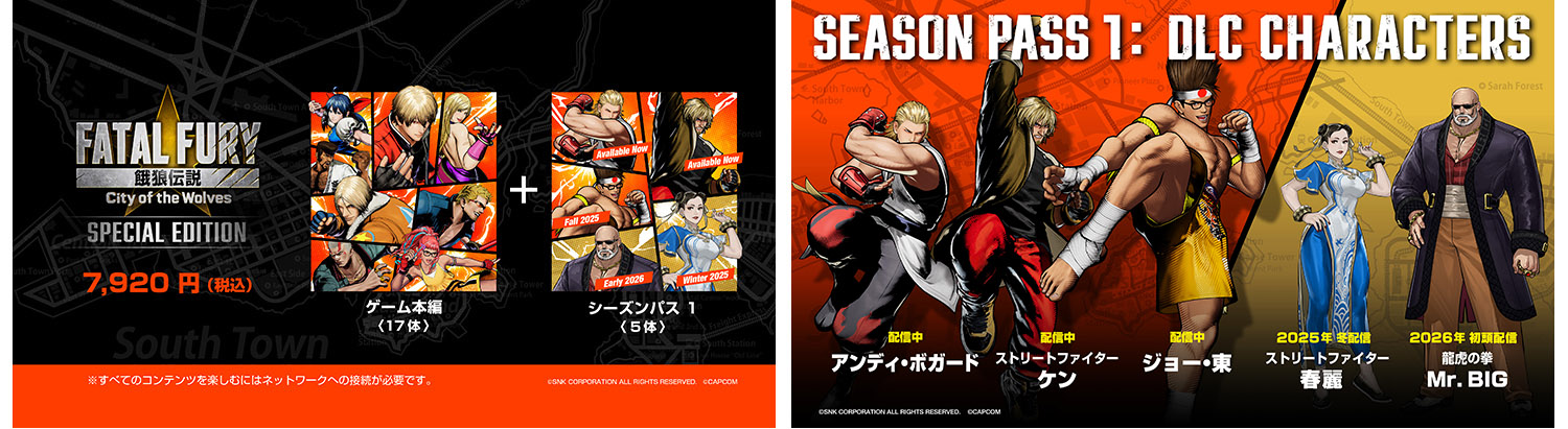 DLCキャラクター「ジョー・東」をはじめ、『ストリートファイター』シリーズの「ケン」、「春麗」などが楽しめるシーズンパス1がセットになった「餓狼伝説 City of the Wolves SPECIAL EDITION」を好評発売中!
