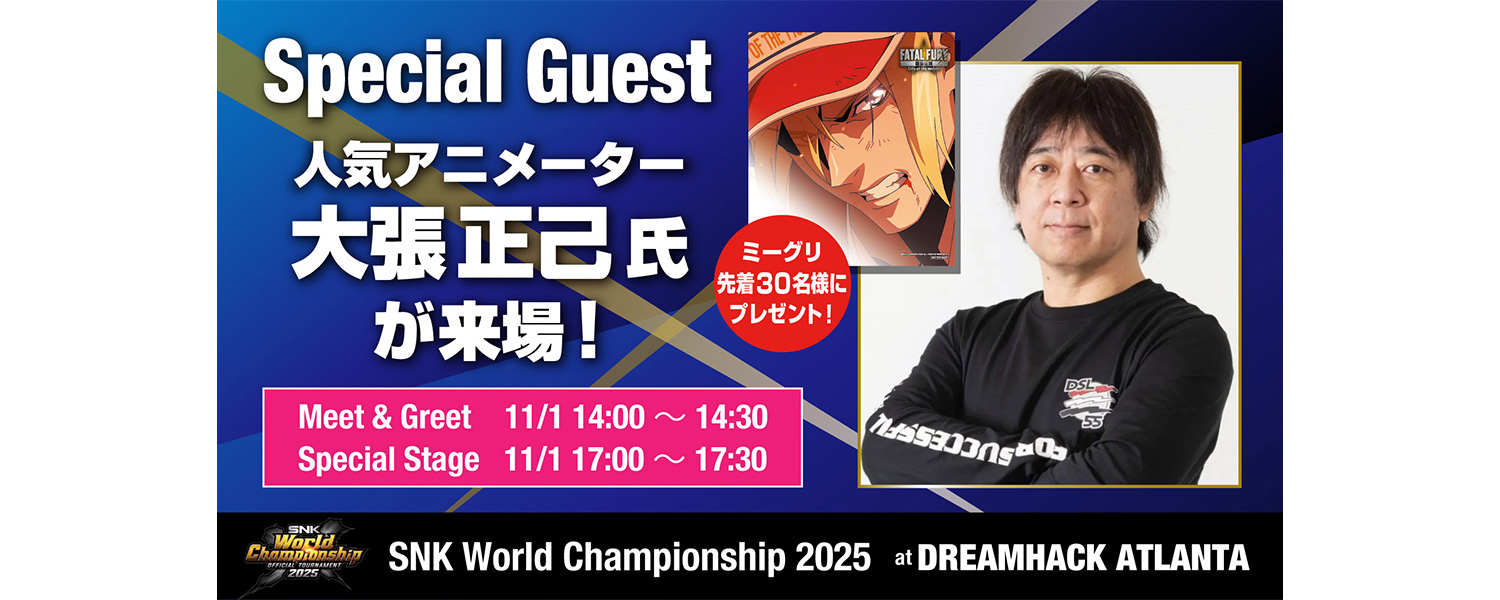 数々の人気アニメーション作品をはじめ、『餓狼伝説City of the Wolves』や『THE KING OF FIGHTERS XV』のスペシャルムービーも手掛ける人気アニメーター大張正己氏が参加!ミート&グリートやSNK開発者とのスペシャルステージを開催!