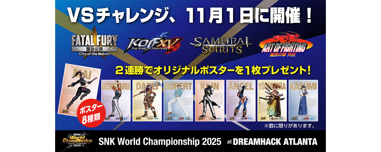 11月1日、SWC LCQエリアにて、『餓狼伝説 CotW』、『KOF XV』、『SAMURAI SPIRITS』、『龍虎の拳 外伝』の連勝チャレンジコーナーを設置。2連勝でオリジナルポスター(全8種類)を1枚プレゼント!コンプリートを目指せ!