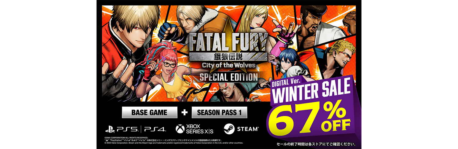株式会社SNKは、好評発売中の対戦格闘ゲーム『餓狼伝説 City of the Wolves』について、すでに開催中のSteam版セールに加え、PS/Xbox版を対象とした「WINTER SALE」を開催することをお知らせいたします。