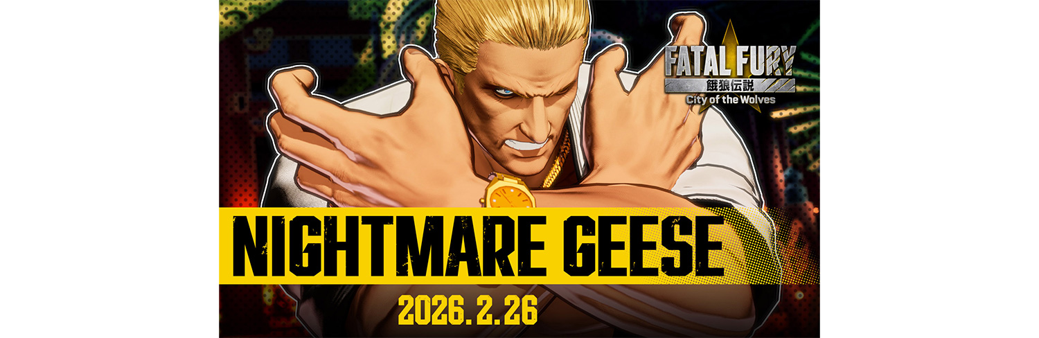 株式会社SNKは、好評発売中の対戦格闘ゲーム『餓狼伝説 City of the Wolves』において、Season 2 DLCキャラクター「ナイトメアギース」を、2026年2月26日より配信することをお知らせいたします。あわせて、『ストリートファイター』とのコラボレーション第3弾を実施いたします。