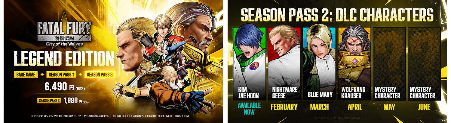Season Pass 2では、『餓狼伝説』シリーズより「キム・ジェイフン」「ナイトメアギース」「ブルー・マリー」「ヴォルフガング・クラウザー」の4キャラクターに加え、後日発表予定のミステリーキャラクター2体を含む、全6キャラクターを毎月順次配信予定。Season 2の配信開始にあわせて、本編+Season Pass 1+Season Pass 2をまとめて楽しめる「餓狼伝説 City of the Wolves Legend Edition」は、6,490円(税込)でお求めいただけます。今後のアップデートで追加されていくキャラクターたちも使用可能となりますので、ぜひこの機会に『餓狼伝説 City of the Wolves』で、新シーズンの盛り上がりをお楽しみください。