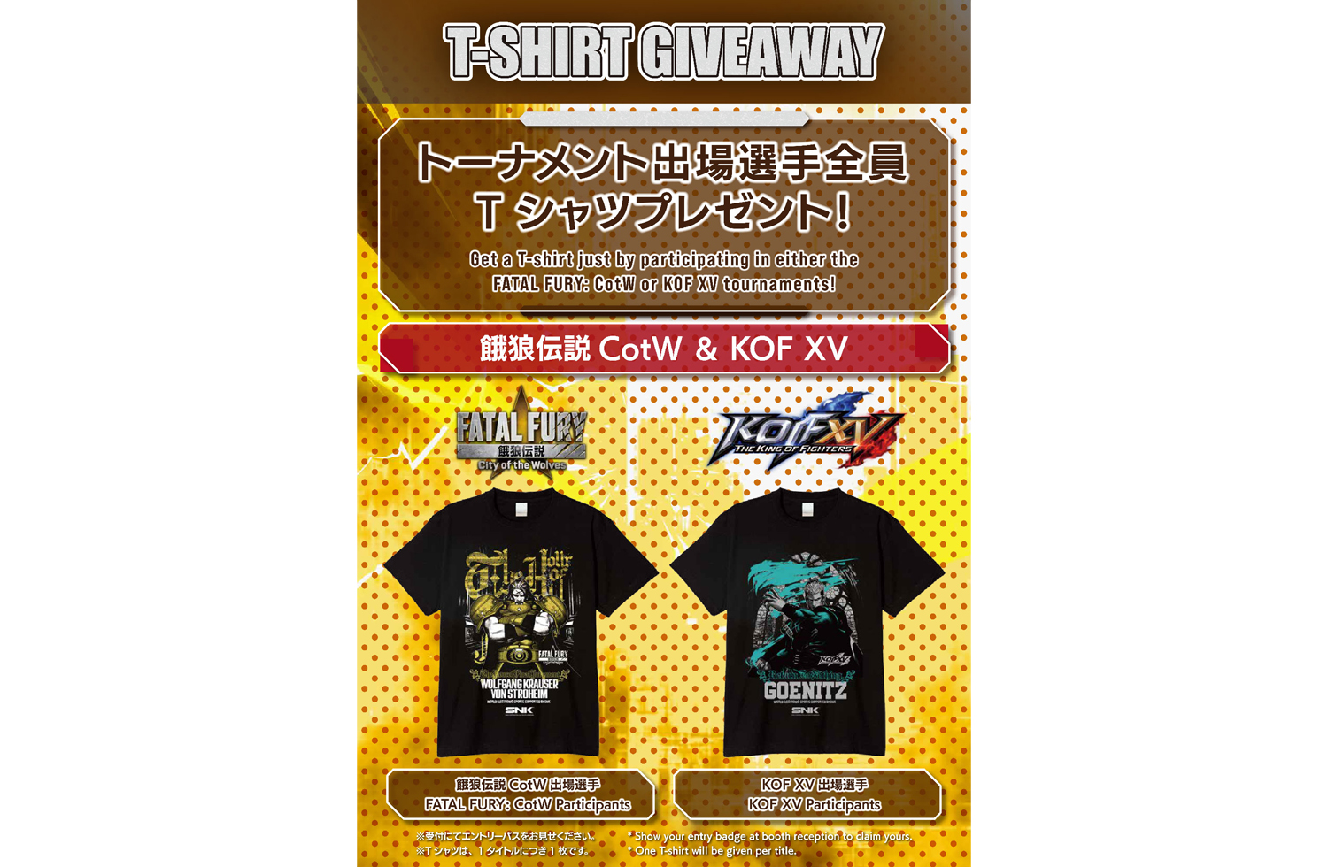 『餓狼伝説City of the Wolves (餓狼伝説CotW)』トーナメント優勝者と『THE KING OF FIGHTERS XV (KOF XV)』トーナメント優勝者には、SNK格闘ゲームの世界大会「SNK World Championship 2026(SWC 2026)」決勝大会の出場権を付与!さらにトーナメント出場選手にもオリジナルTシャツをプレゼントします。