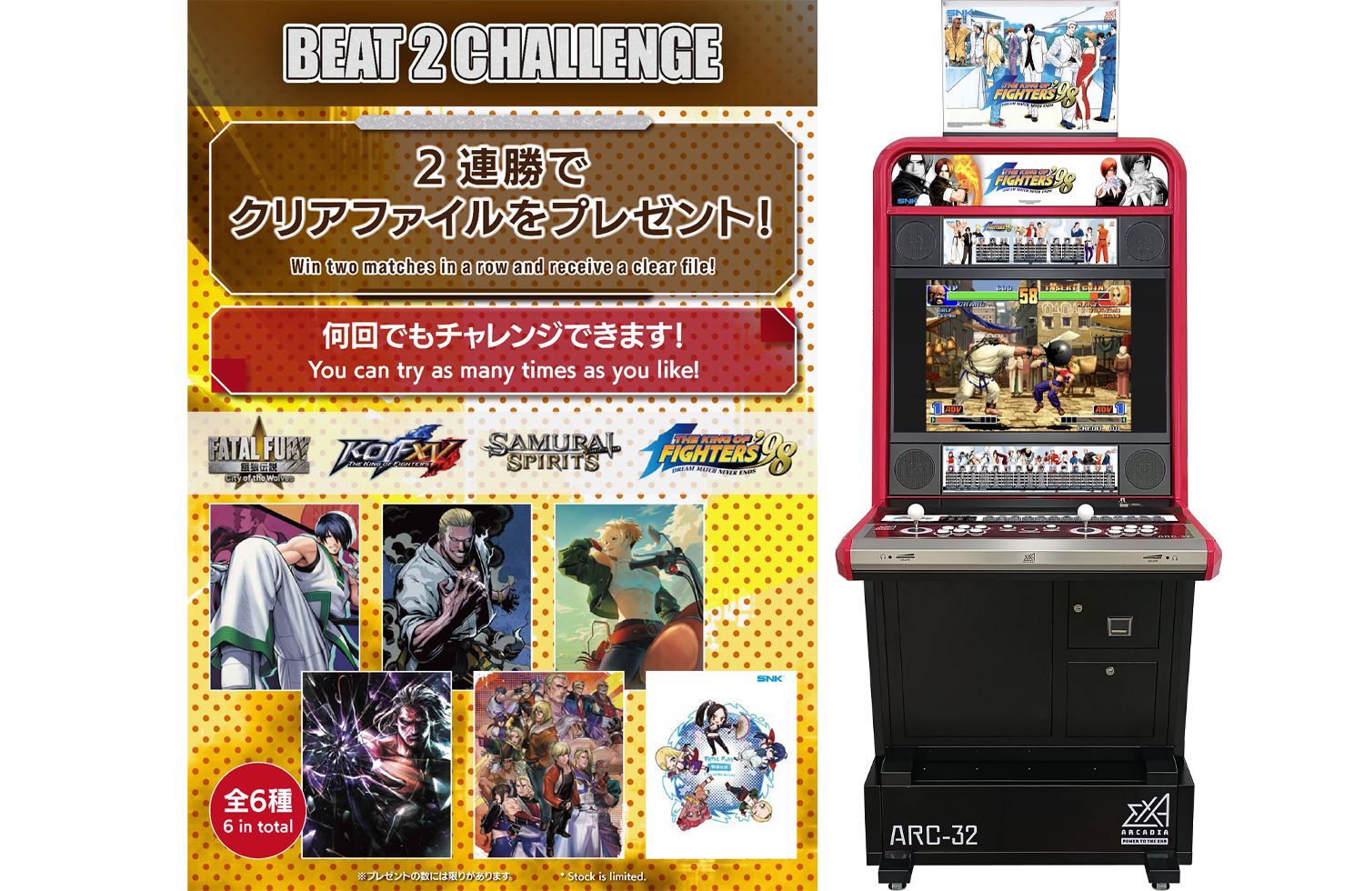 『餓狼伝説CotW』、『KOF XV』、『SAMURAI SPIRITS』、『KOF ’98』の対戦台を設置。さらに『KOF ’98』は、ゲームセンター感覚で対戦が楽しめるexA-Arcadia筐体を使用!2連勝した参加者には、『餓狼伝説CotW』クリアファイル(全6種)を1枚プレゼント。何回もチャレンジしてコンプリートを目指そう!