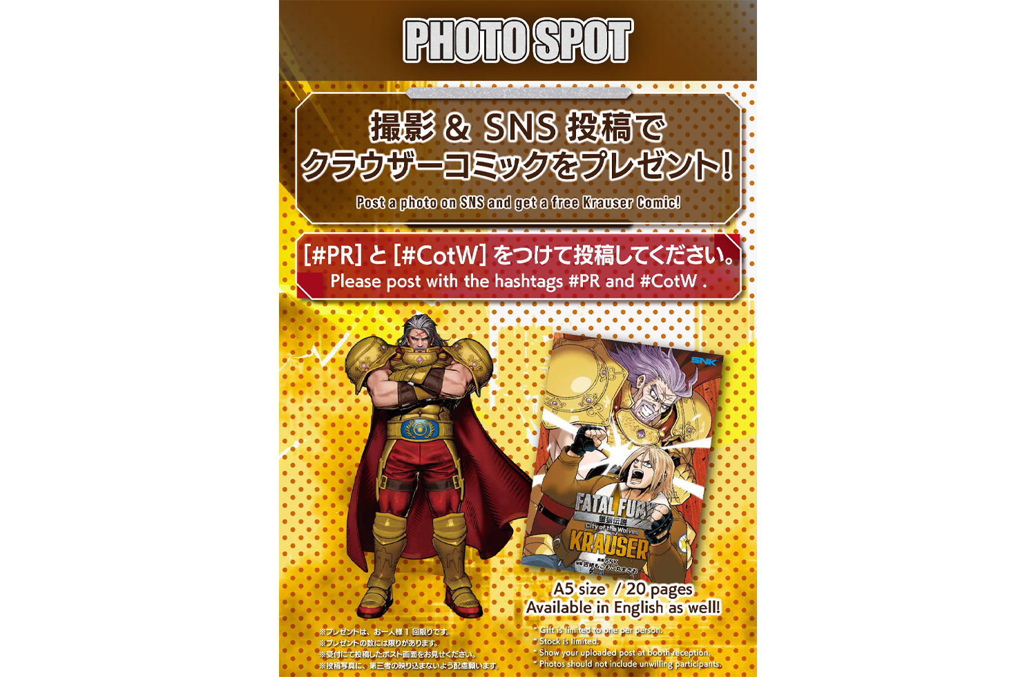 SNKブース内のフォトスポットで撮影した写真にハッシュタグ( #PR #CotW )をつけて、SNSに投稿すると、『餓狼伝説CotW』のクラウザーコミックをプレゼント!