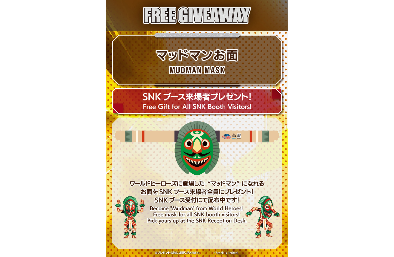 格闘ゲーム『ワールドヒーローズ』シリーズに登場する人気キャラクター「マッドマン」のお面をプレゼント!ぜひSNKブースにご来場ください!