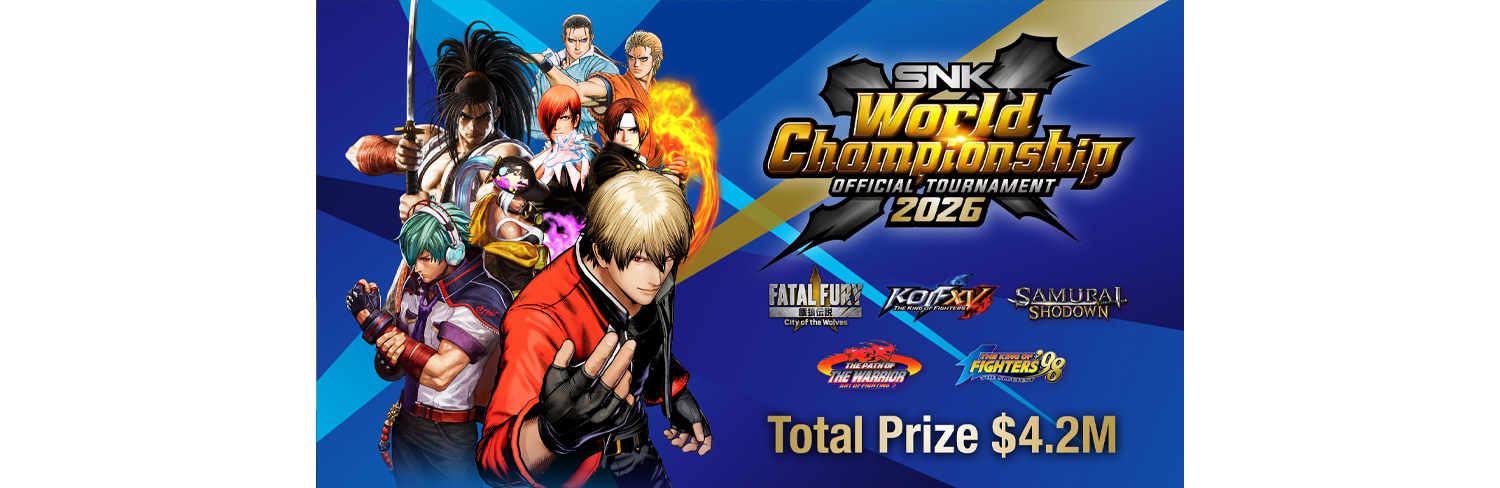 「SNK World Championship 2026」は、SNKの格闘ゲーム5タイトル『餓狼伝説 City of the Wolves』、『THE KING OF FIGHTERS XV』、『SAMURAI SPIRITS』、『ART OF FIGHTING 龍虎の拳外伝』、『THE KING OF FIGHTERS ’98』を競技種目とするeスポーツ世界大会です。2026年1月から順次開催される予選大会で好成績を収めたプレイヤーが、決勝大会の出場権を獲得。予選と決勝を合わせた賞金総額は$4,200,000!SNK格闘ゲームの祭典に、ぜひご参加ください!