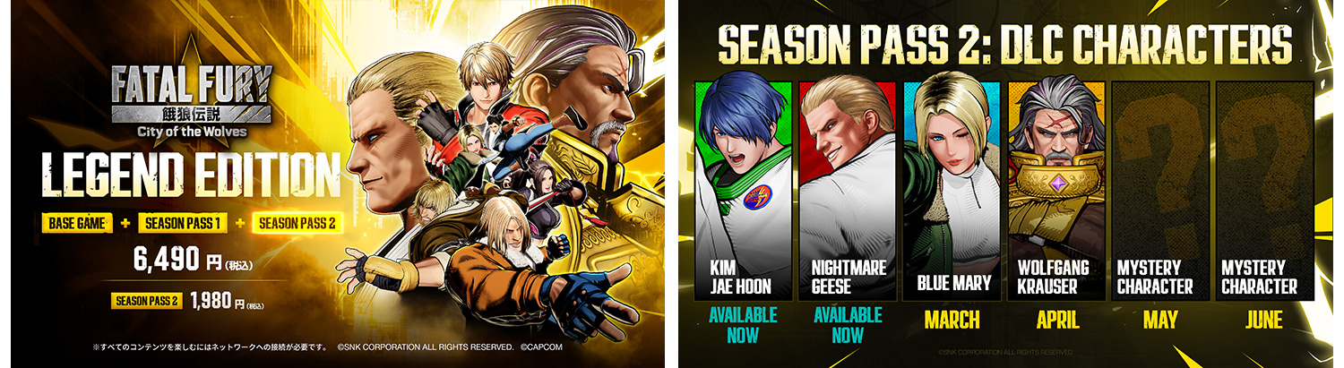 Season Pass 2では、『餓狼伝説』シリーズより「キム・ジェイフン」「ナイトメアギース」「ブルー・マリー」「ヴォルフガング・クラウザー」の4キャラクターに加え、後日発表予定のミステリーキャラクター2体を含む、全6キャラクターを毎月順次配信予定。Season 2の配信開始にあわせて、本編+Season Pass 1+Season Pass 2をまとめて楽しめる「餓狼伝説 City of the Wolves Legend Edition」が、6,490円(税込)でお求めいただけます。今後のアップデートで追加されていくキャラクターたちも使用可能となりますので、ぜひこの機会に『餓狼伝説 City of the Wolves』で、新シーズンの盛り上がりをお楽しみください。