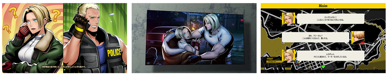 また「ARCADE MODE」では、サウスタウンで休暇中のマリーの元に「秦の秘伝書」と「ギースの遺産」に関する情報が舞い込み、シュトロハイムが開催するKOFへ参戦する物語が描かれます。