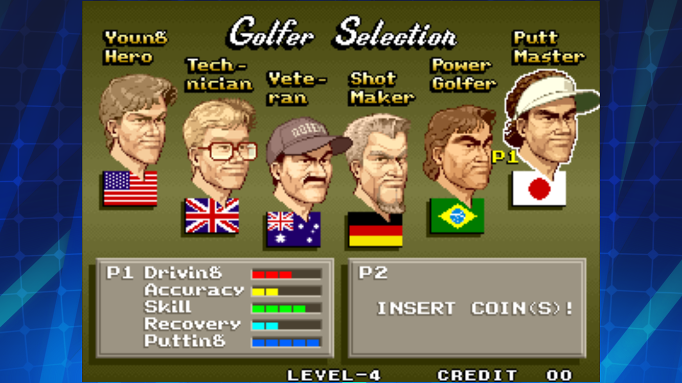 BIG TOURNAMENT GOLF is a golf game released by SNK in 1996.Players can choose from a total of six golfers with different abilities and play on courses located around the world such as Australia or Germany.Players can test out their golf game skills against friends with game modes such as "STROKE PLAY" and "MATCH PLAY (2P battle only)".