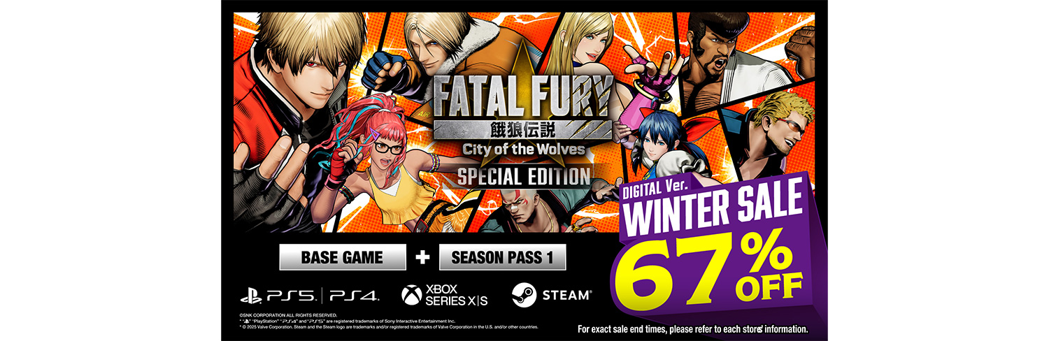 Osaka, Japan — SNK today announced a special Winter Sale for the PlayStation and Xbox versions of FATAL FURY: City of the Wolves. This expands the scope of the game’s current discounts from Steam only to consoles as well—just in time for the festive holiday season.