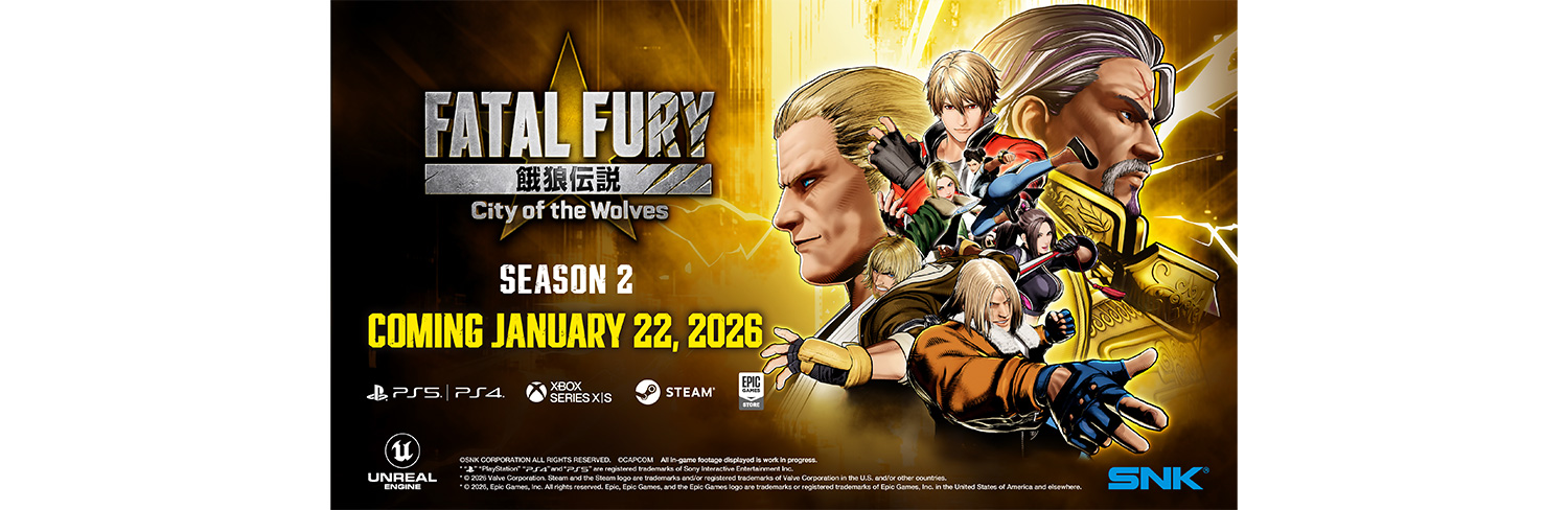 SNK Corporation today announced that Season 2 of FATAL FURY: City of the Wolves will begin on January 22, 2026.Season 2 adds six characters (including legendary fighters who epitomize the franchise and its history) to the roster, with one character joining each month. Four combatants have already been revealed; the remaining two mystery challengers will be announced at a later date.