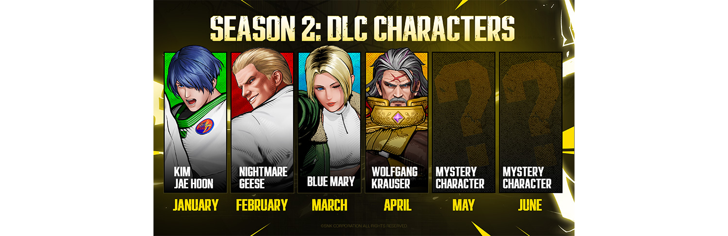 SNK plans to release one character every month for six months in Season 2, beginning with its January 22 kickoff.In addition to the four long-awaited additions below, two mystery challengers will also join the fray. More information about their identities will be revealed in due course, so stay tuned!Experience this ever-evolving legend and the exhilarating battles within as we enter a new season!