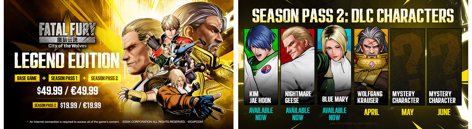 Season Pass 2 will feature six characters, with one character scheduled for release every month. The Season 2 lineup includes Kim Jae Hoon, Nightmare Geese, Blue Mary, and Wolfgang Krauser from the Fatal Fury series, plus two mystery characters who will be announced at a later date. The FATAL FURY: City of the Wolves Legend Edition, which bundles the base game with Season Pass 1 and Season Pass 2, is available for $49.99 / €49.99 and grants access to existing fighters as well as all new Season 2 arrivals upon their release.