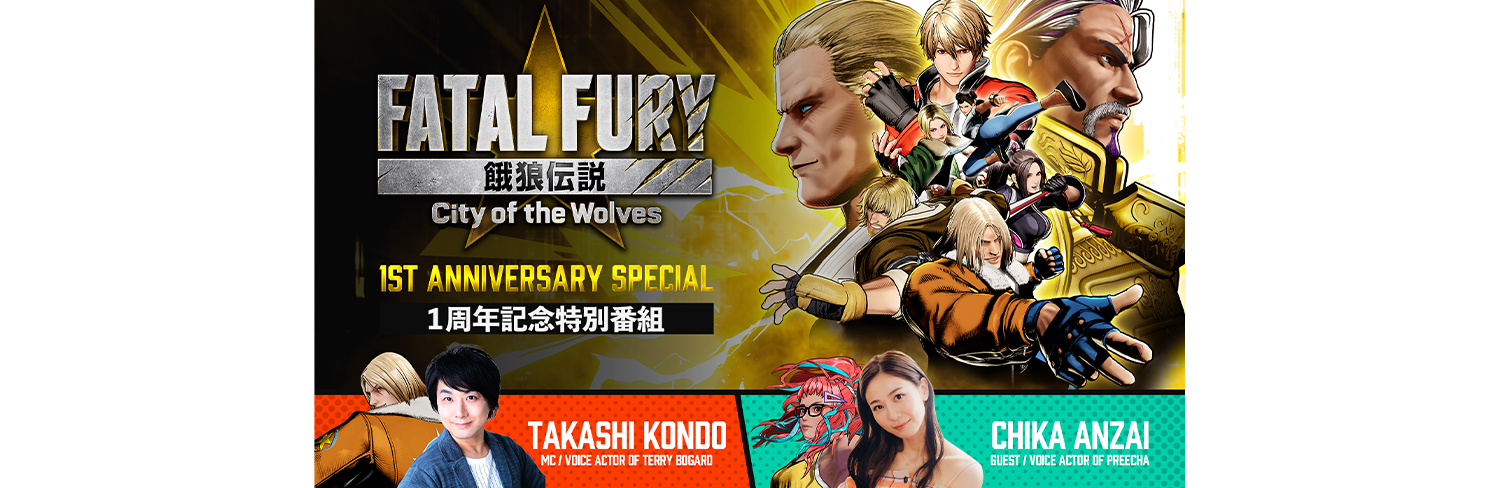Join voice actors Takashi Kondo and Chika Anzai as we look back on a mammoth first year of Fatal Fury—featuring video retrospectives, community comments, dev team greetings, and more. The program will also include special video messages from players in the esports scene and details about the aforementioned major update.