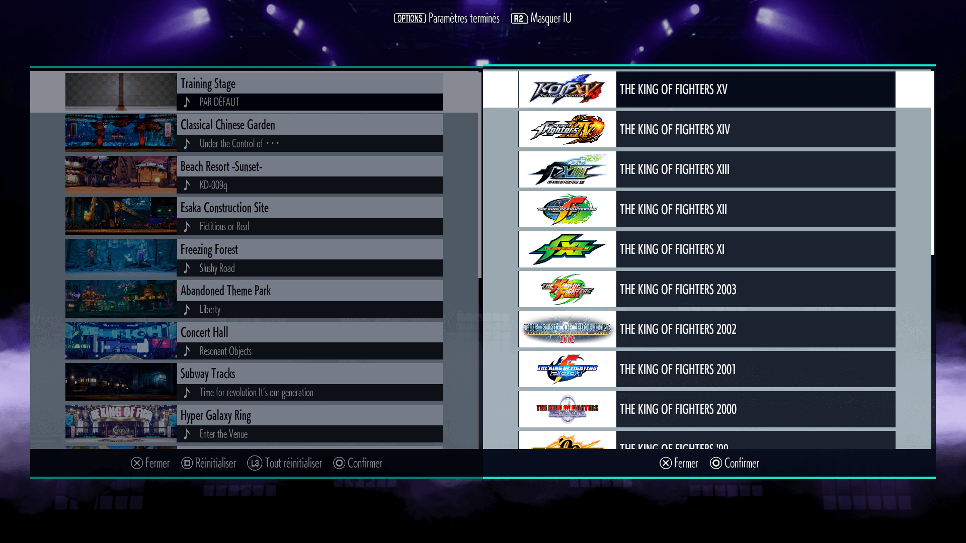 Cet écran vous permet de choisir la musique qui sera jouée dans le menu principal, dans l'écran de sélection des personnages et pendant les combats. Choisissez l'élément que vous voulez personnaliser avec R1 et R2 (PS4™/PS5™) ou RB et LB (Xbox Series X|S), puis appuyez sur le bouton Confirmer. Une liste de musiques apparaîtra alors sur le côté droit de l'écran et vous pourrez choisir la musique que vous voulez jouer.