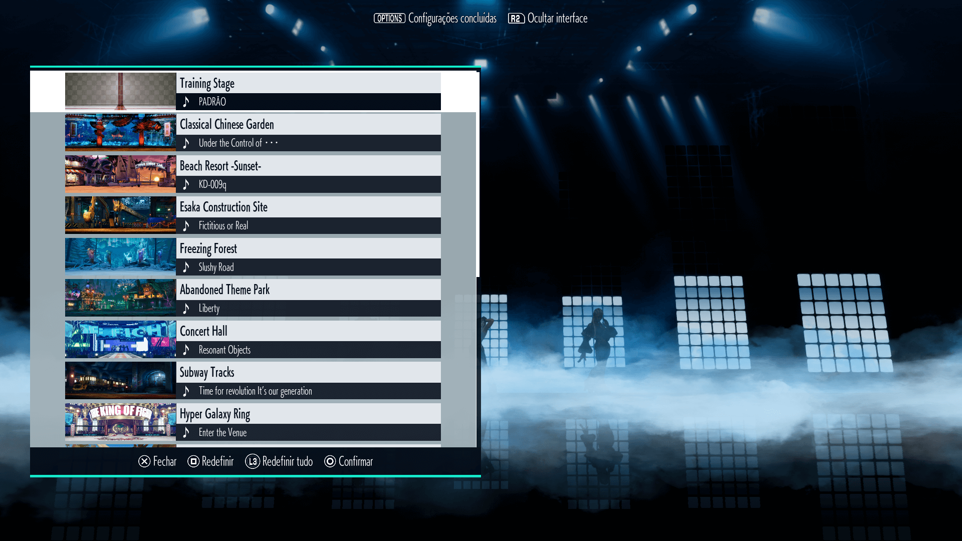 Pressione o botão Confirmar para exibir uma tela de personalização de lista, onde você pode ajustar qual música será reproduzida em cada estágio.