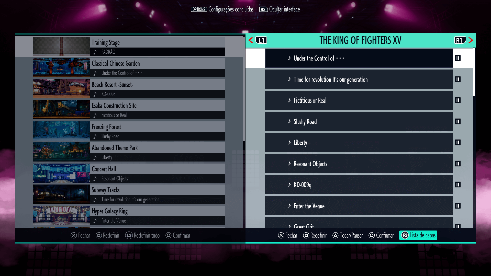 Músicas famosas de jogos anteriores da série KOF começam bloqueadas, pois ainda não foram reproduzidas no jogo.