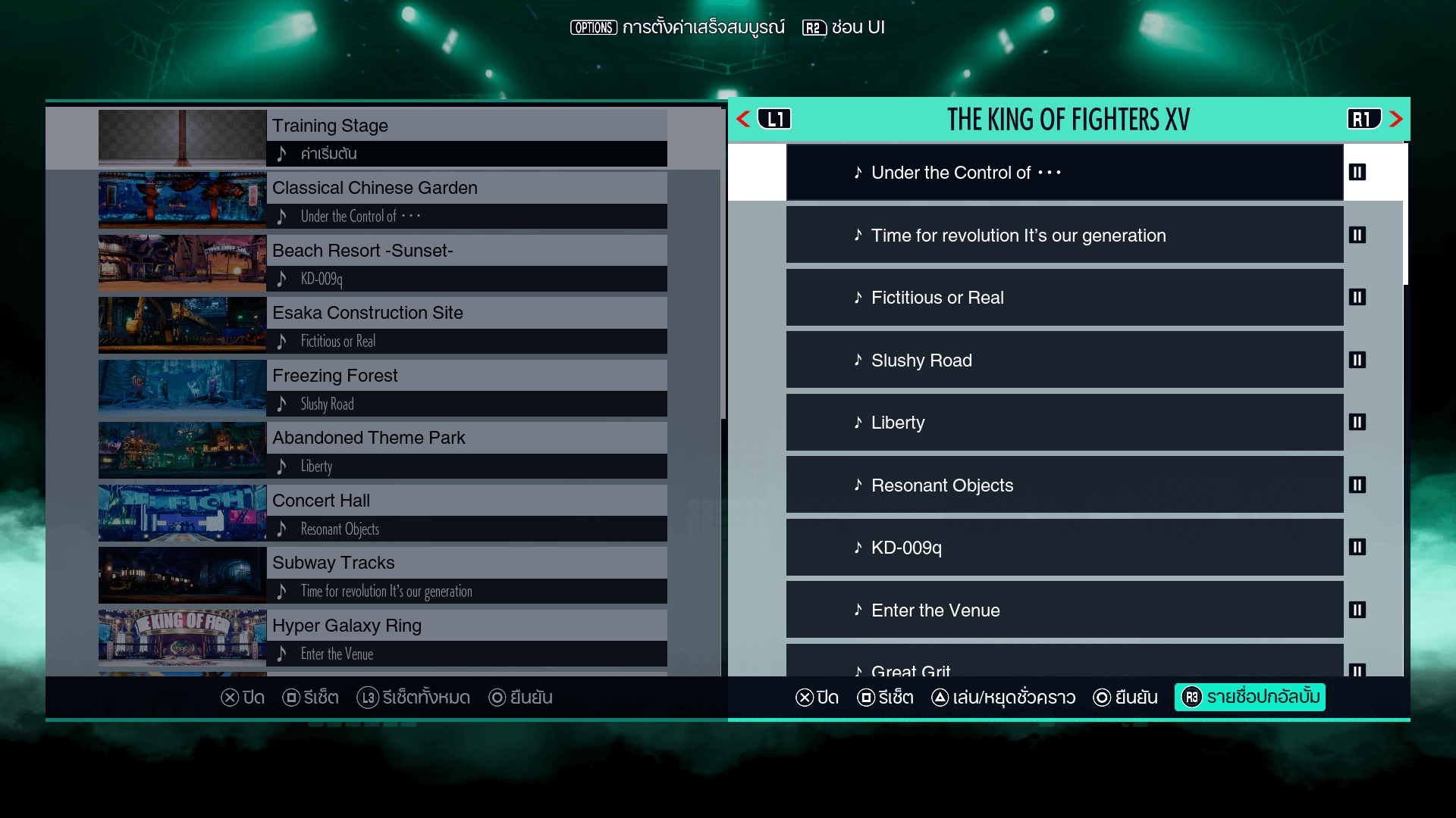 หน้าจอนี้ให้คุณเลือกเพลงที่จะเล่นบนเมนูหลัก, บนหน้าจอเลือกตัวละคร และระหว่างแบตเทิล เลือกรายการที่คุณต้องการปรับแต่งด้วย R1 และ R2 (PS4™/PS5™) หรือ RB และ LB (Xbox Series X|S) แล้วกดปุ่มยืนยันเพื่อเปิดรายการเพลงทางด้านขวาของหน้าจอ