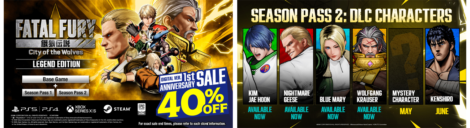 為慶祝《餓狼傳說 City of the Wolves》1週年,現正舉辦針對「餓狼傳說 City of the Wolves Legend Edition」的限時40%折扣「1st Anniversary Sale」。