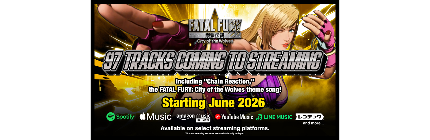 《餓狼傳說 City of the Wolves》的樂曲,決定將在各種音樂訂閱服務中發布。預計收錄包括主題曲「Chain Reaction」在內的全部97首曲目。