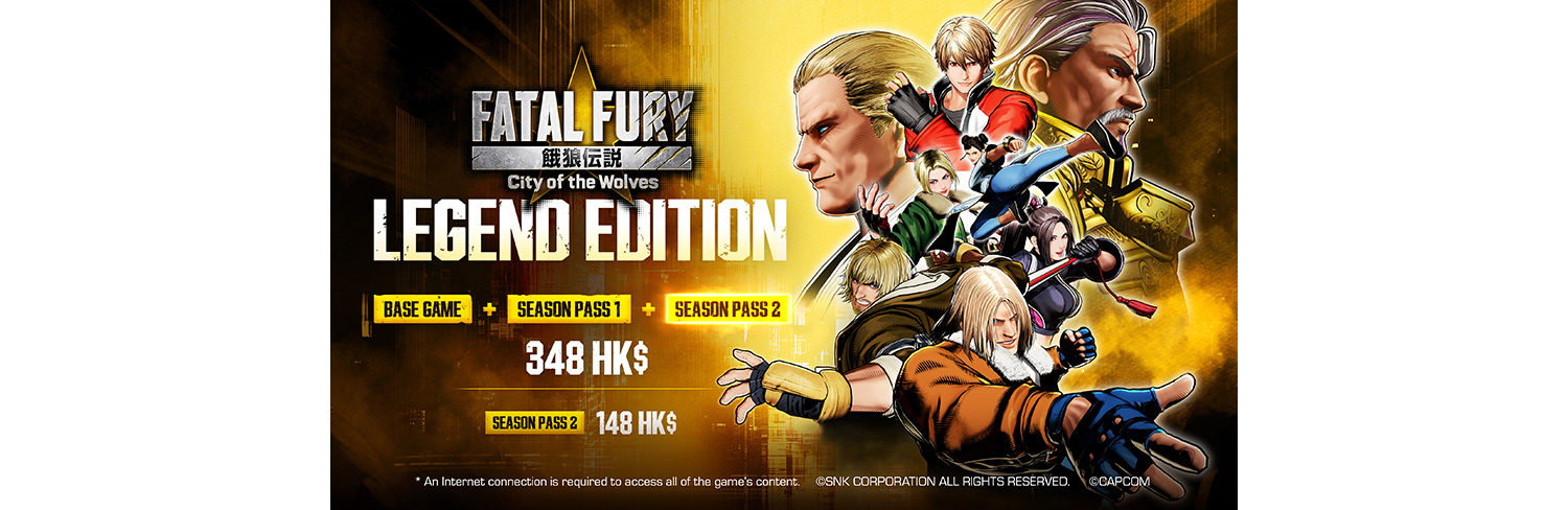 在Season Pass 2中,將會依序上線來自餓狼傳說系列的四位角色「金在勳」、「噩夢吉斯」、「布魯·瑪麗」、「沃爾夫岡·克勞薩」,以及後日發表的兩位神秘角色,共計六位角色。配合Season 2的直播,本篇+Season Pass 1+Season Pass 2的「餓狼傳說 City of the Wolves Legend Edition」將以HKD 348/TWD 1,390元的價格登場,並且未來的更新中也將能使用新增的角色。請務必把握這個機會,在《餓狼傳說 City of the Wolves》中享受新賽季的開幕。