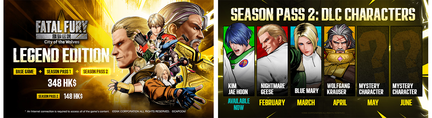 在Season Pass 2 中,將會依序上線來自《餓狼傳說》系列的四位角色「金在勳」、「噩夢吉斯」、「布魯·瑪麗」、「沃爾夫岡·克勞薩」,以及後日發表的兩位神秘角色,共計6位角色。配合第2季的開始,本篇+Season Pass 1+Season Pass 2 的「餓狼傳說 City of the Wolves Legend Edition」將以 HKD348/TWD1,390 的價格出售。未來的更新中也將能使用新增的角色,請務必把握這個機會,在《餓狼傳說 City of the Wolves》中享受新賽季的盛況。